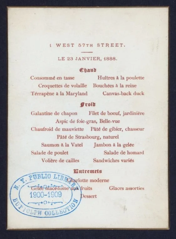 Restaurants and transport aren’t the only place you find menus. The New York Public Library houses several large collections of menus that include private parties. Often, these were one-off menus for parties hosted at restaurants, but some parties were hosted in private homes as well. For example, check out this menu from a January 23, 1888 dinner hosted by Mrs. Cornelius Vanderbilt at their home at 1 West 57th St, New York. The menu featured hot and cold dishes and entremets, all in French. My 7 years of French (25 years ago) is not quite up to the task of translating the old-fashioned culinary terms, though I can say with confidence that they served cold glazed ham and cold chicken salad.